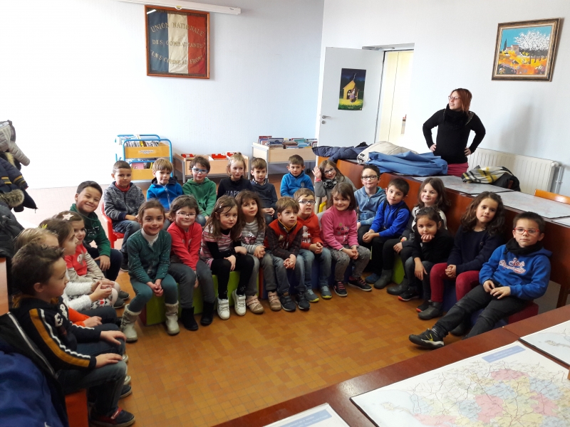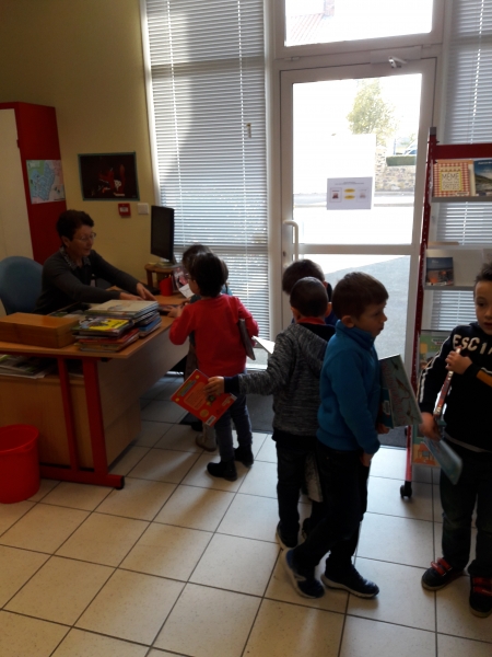 Tous les mois, les élèves de GS-CP se rendent à la bibliothèque municipale où nous accueille Marie-Thérèse.