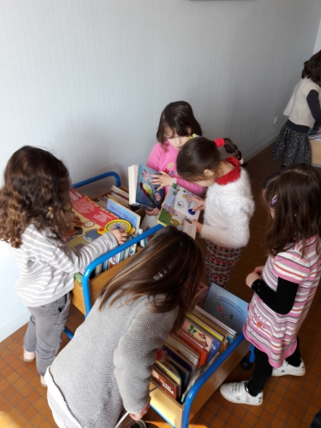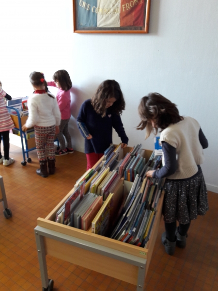Puis, nous avons un temps pour choisir des albums ou petits livres adaptés au niveau des CP que nous empruntons pour un mois environ.