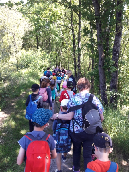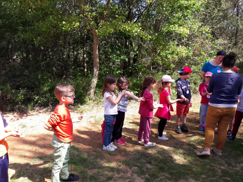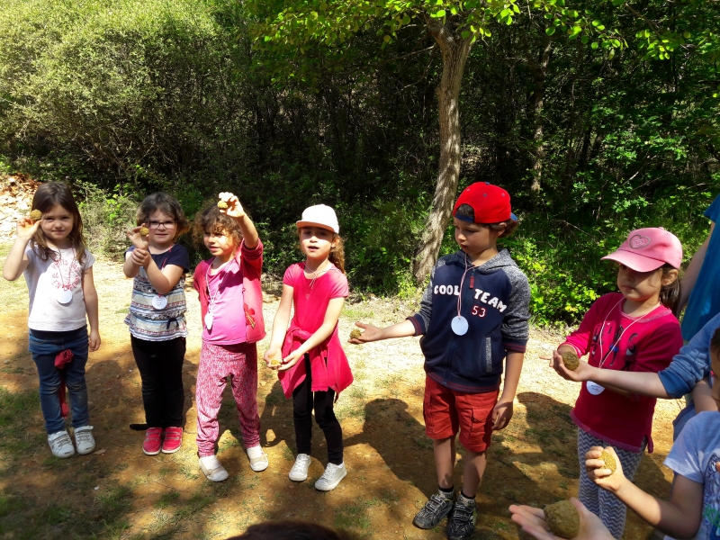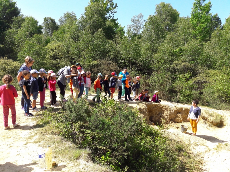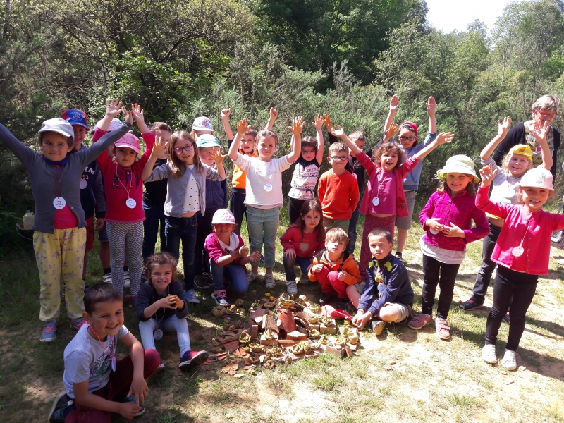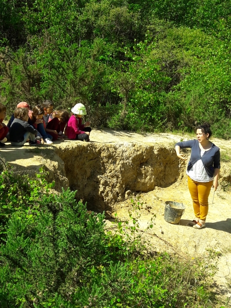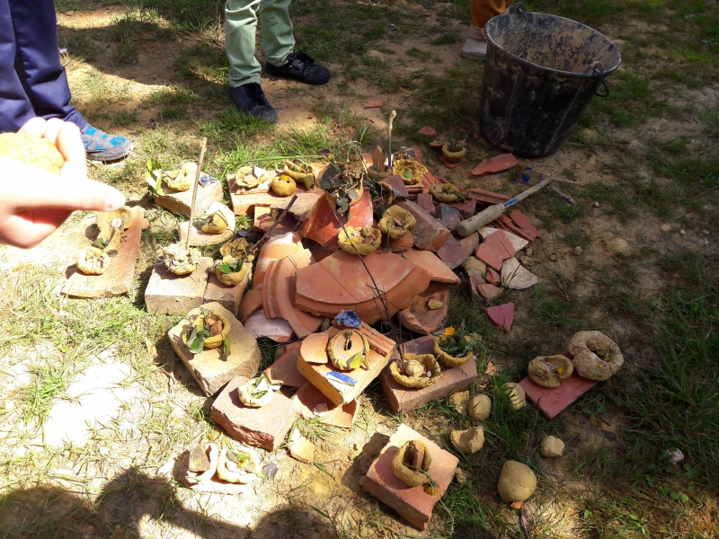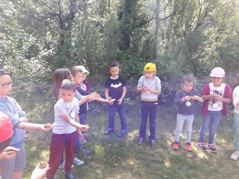 Nous avons ensuite visité la carrière et Marie nous a expliqués comment la terre est récupérée pour la fabrication de l’argile. Nous avons pu toucher la terre juste ramassée et en y ajoutant de l’eau, nous avons confectionné des petites boules d’argile que nous avons ensuite transformées en petit pot. Chacun notre tour, nous sommes allés cueillir des fleurs, ramasser des herbes ou des branchages pour mettre dans notre pot avant de l’offrir à la nature.