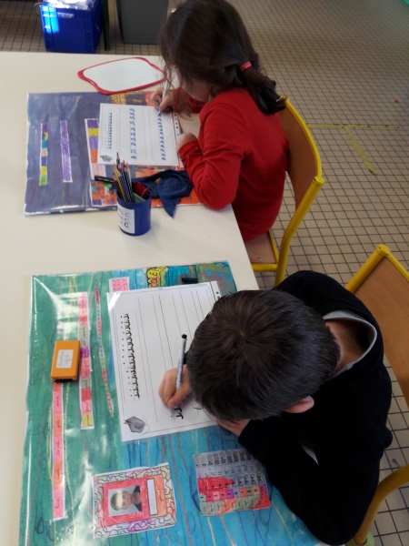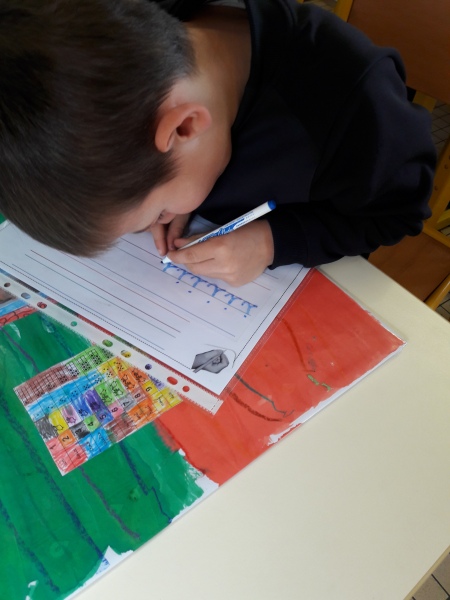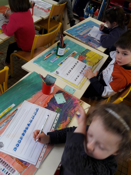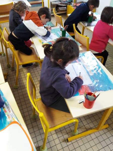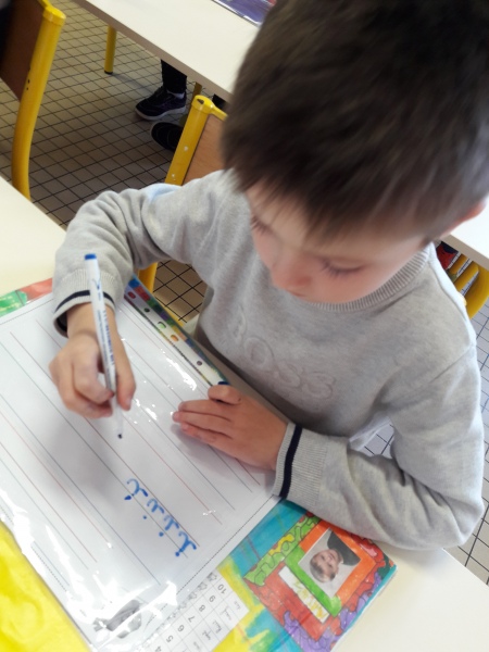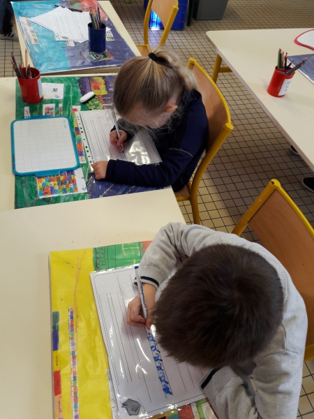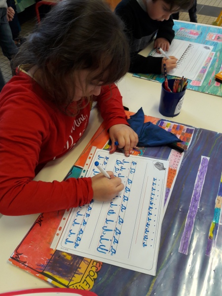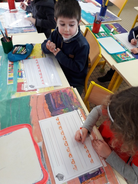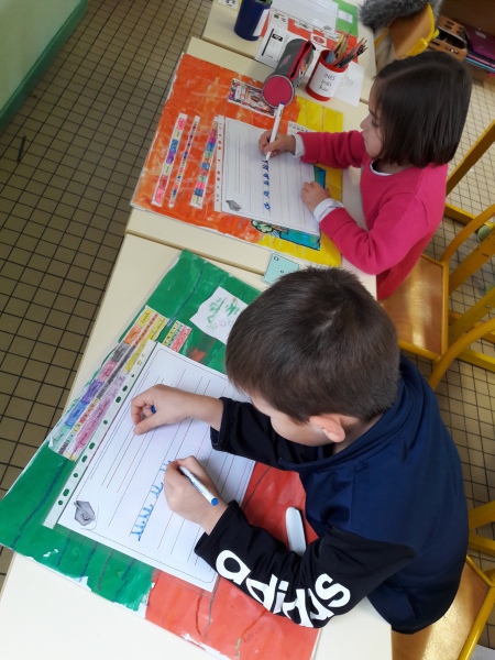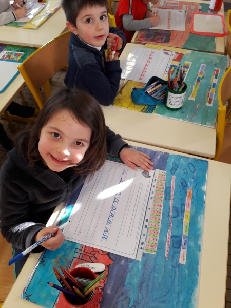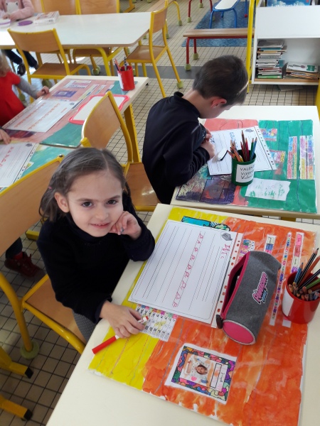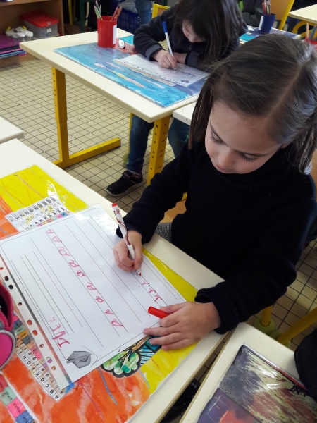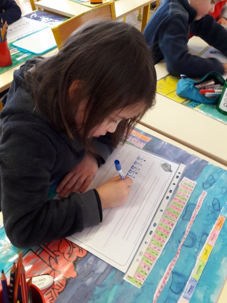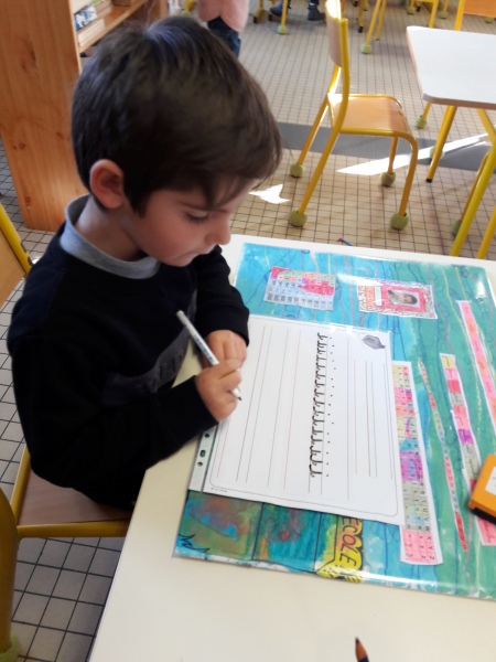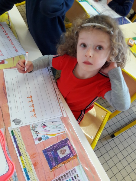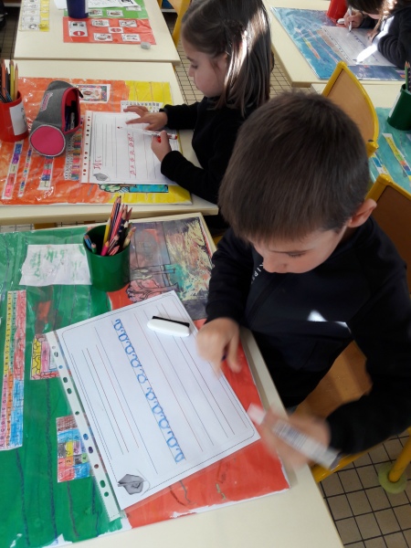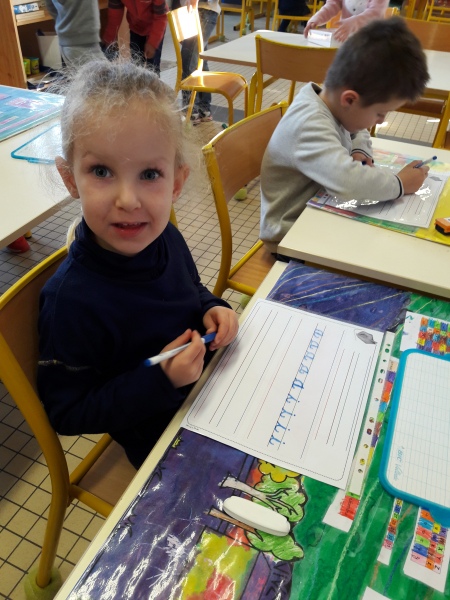 Les GS ont continué à s’entrainer à l’écriture des lettres voyelles, nous avons retravaillé le a et le i. Puis le o et le u.