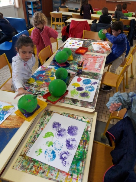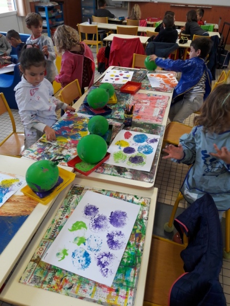 - peinture de la couverture du cahier de vie à l’aide de ballons de baudruche pour laisser de jolies traces rondes