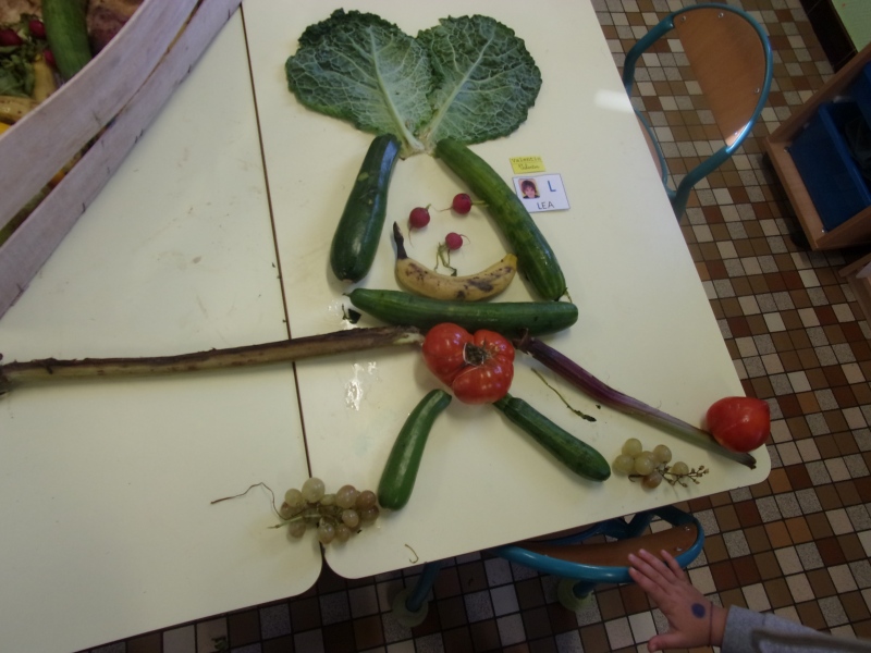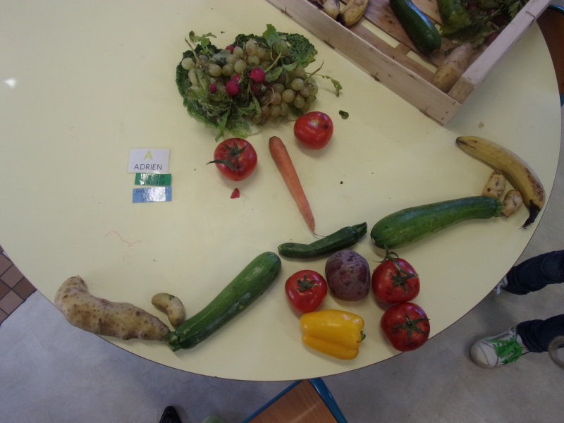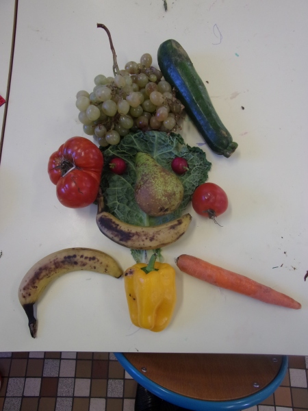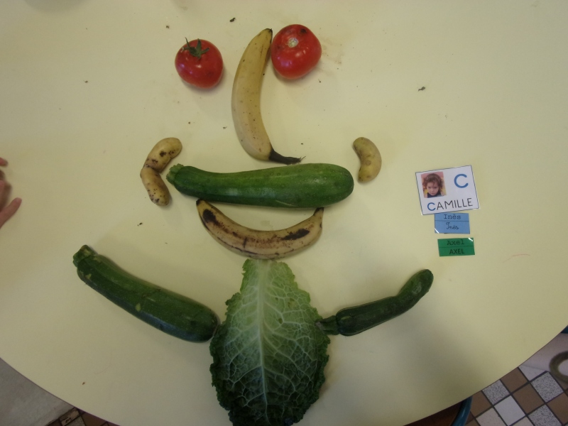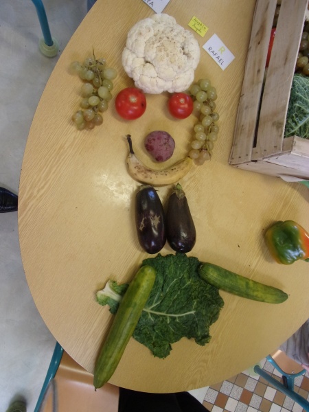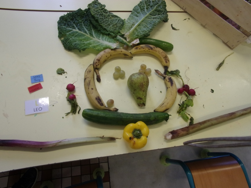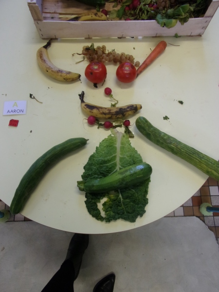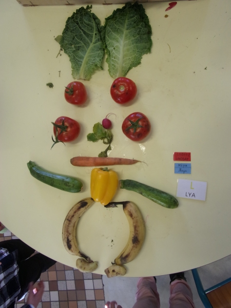 Les enfants ont eu pour consigne de faire à leur tour un personnage mais cette fois-ci en se servant des fruits et légumes à disposition. Ils étaient réunis par groupe de 2 ou 3.