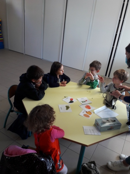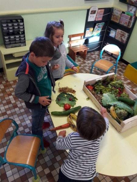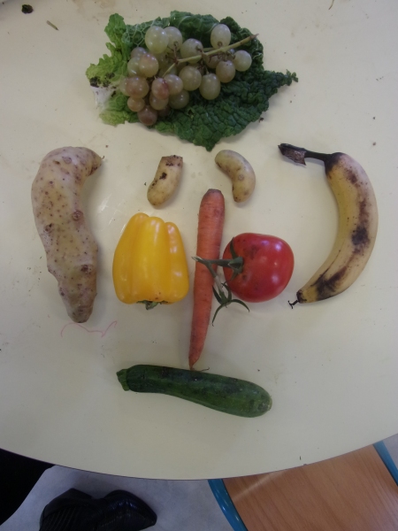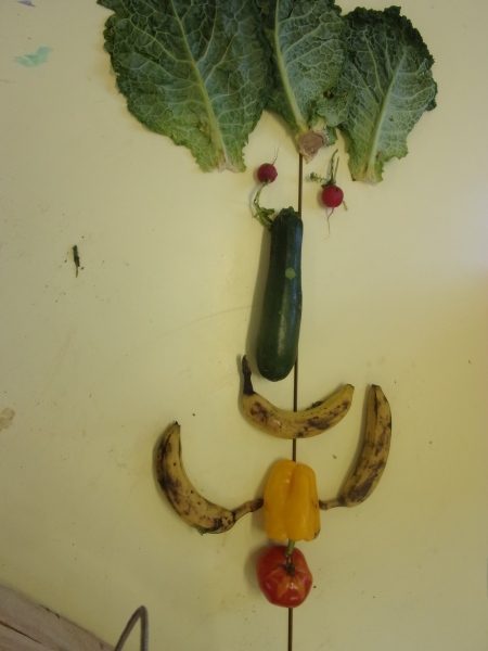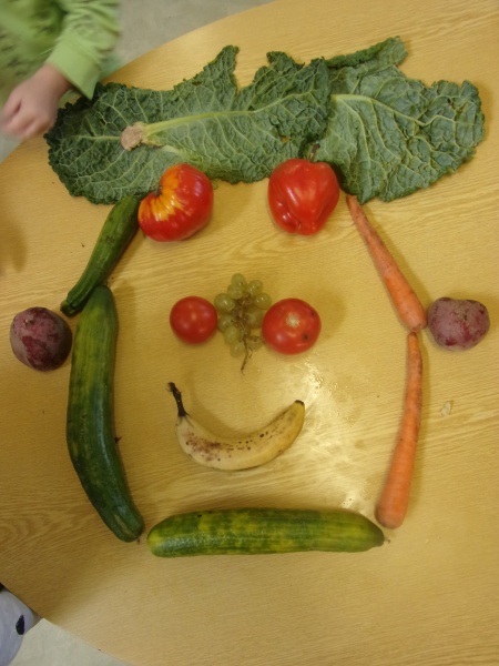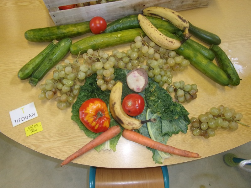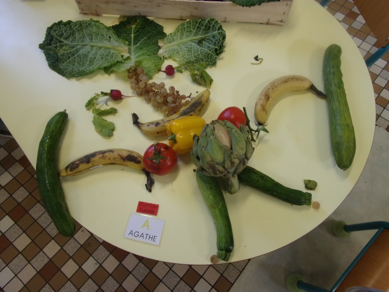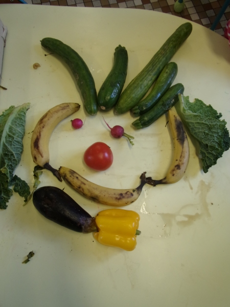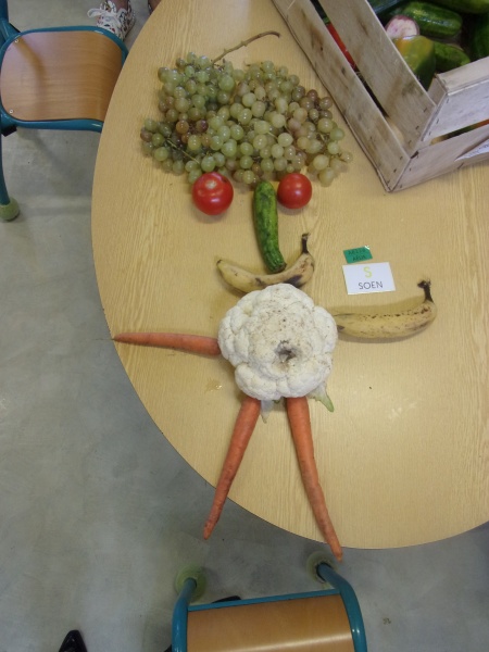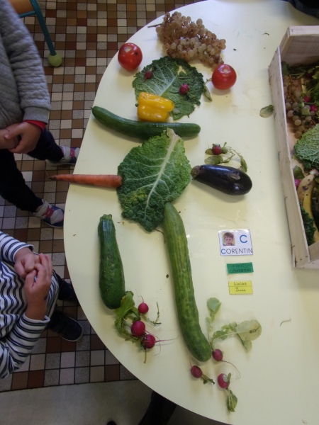 Les enfants ont eu pour consigne de faire à leur tour un personnage mais cette fois-ci en se servant des fruits et légumes à disposition. Ils étaient réunis par groupe de 2 ou 3.