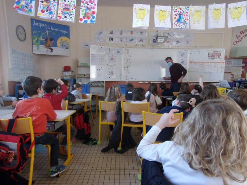 Ce mardi 8/12/2020, Jérémy, intervenant auprès de la Cicadelle, est venu à l’école pour nous parler de Perlette la goutte d’eau. Il nous a expliqué que Perlette peut se transformer pour devenir solide, gazeuse ou liquide dans la nature. Il nous a également appris comment fonctionne le cycle de l’eau grâce à différentes expériences que nous avons faites en classe par petits groupes.