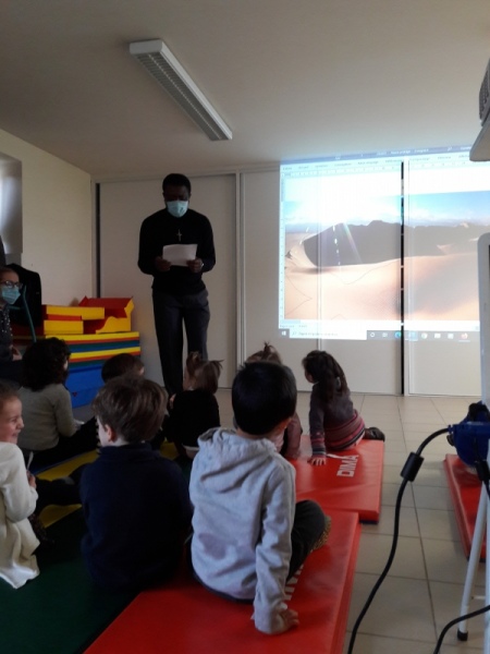 Lundi 15 février, les deux classes de l’école se sont réunies pour vivre un temps de célébration pour nous faire entrer dans la période du Carême. Nous avons fait la rencontre du Prêtre Verkys, nouveau prêtre de la paroisse.