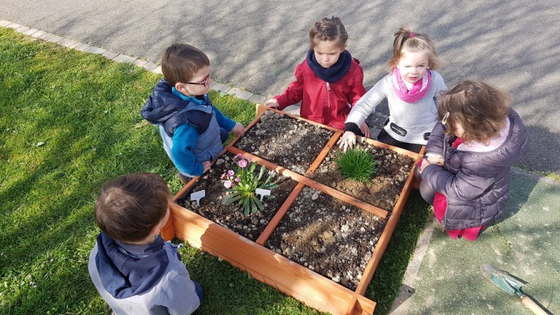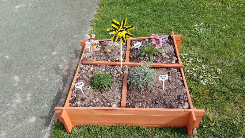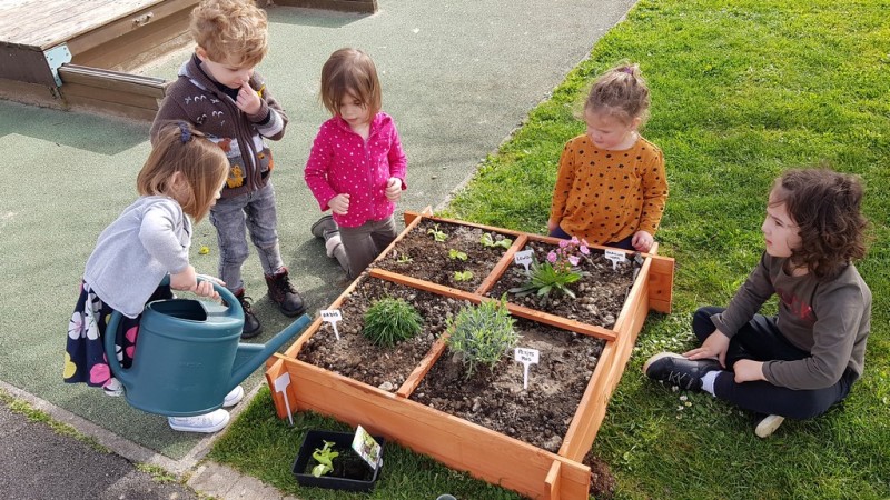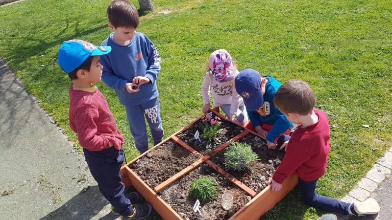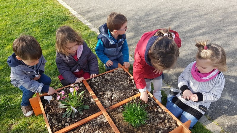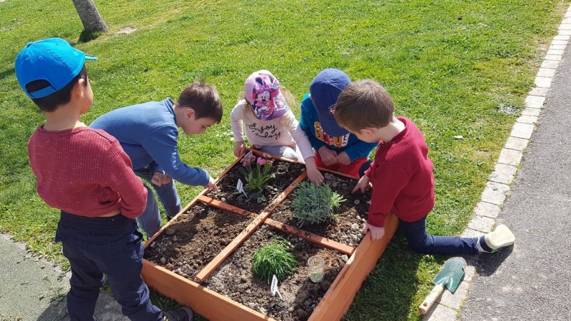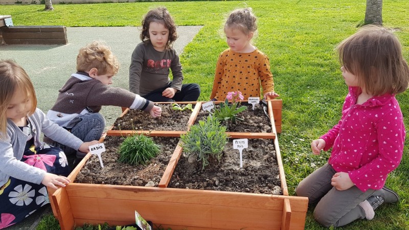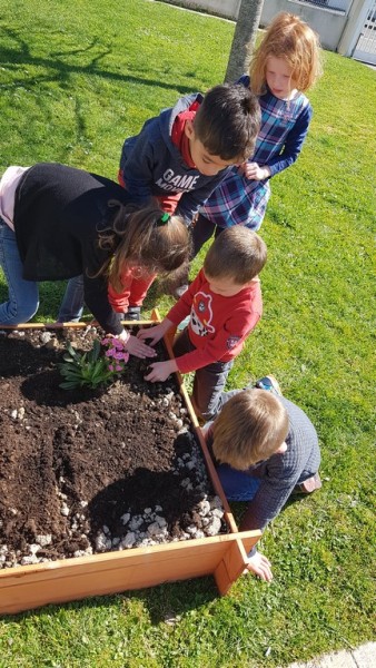En ce début de printemps, les enfants ont fait un peu de jardinage à l’école. En effet, ils ont pu planter (lavande, salades…) et semer (radis, petits pois…) dans un carré potager installé sur la cour.