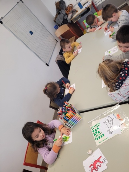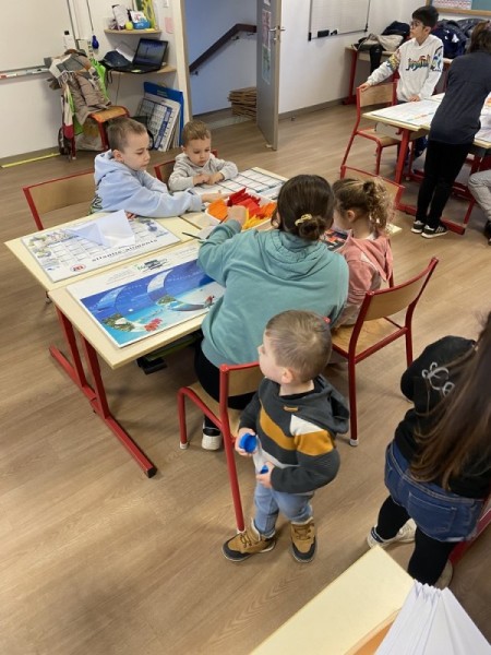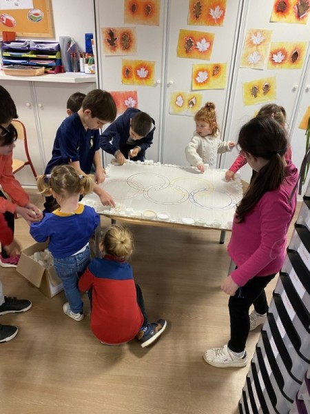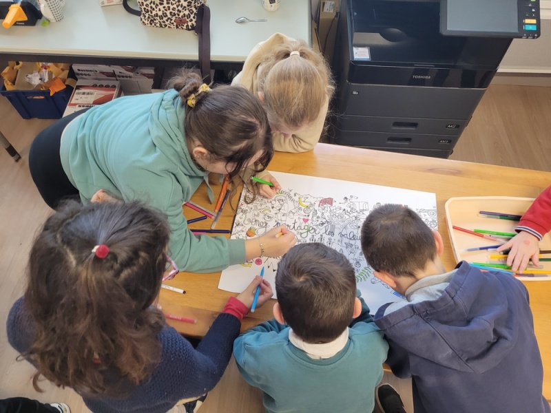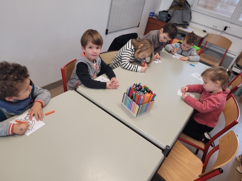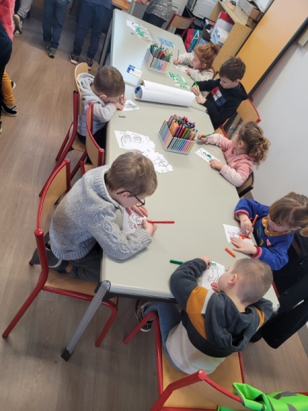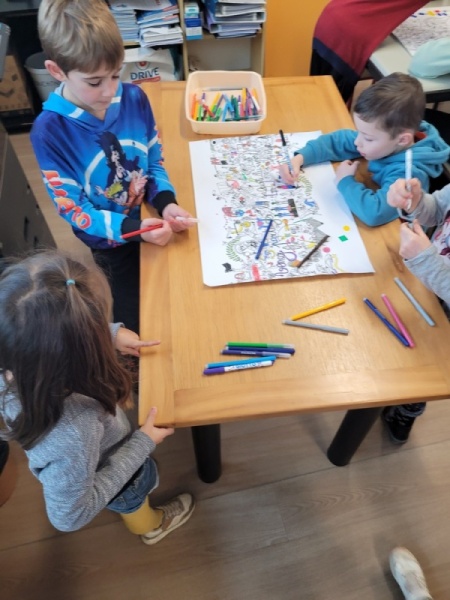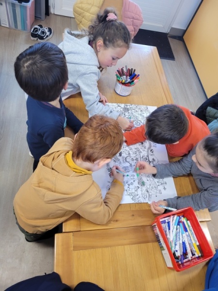 • Coloriage individuel pour les petits et collectif pour les grands. Les TPS/PS/MS ont participé à la fresque collective en collant des gommettes.