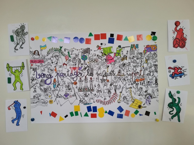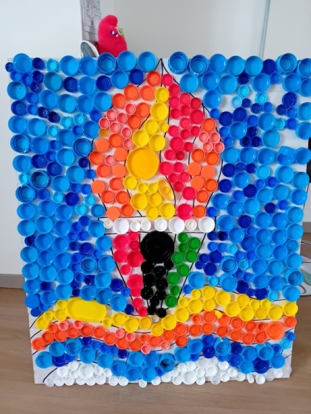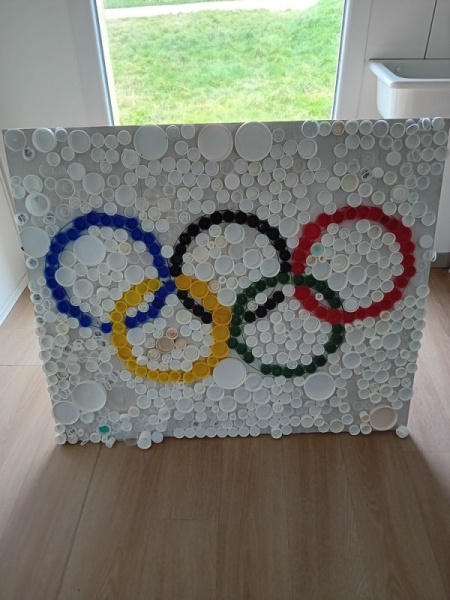 • Fabrication d’une flamme et réalisation de panneaux (anneaux et flamme olympiques) avec des bouchons.