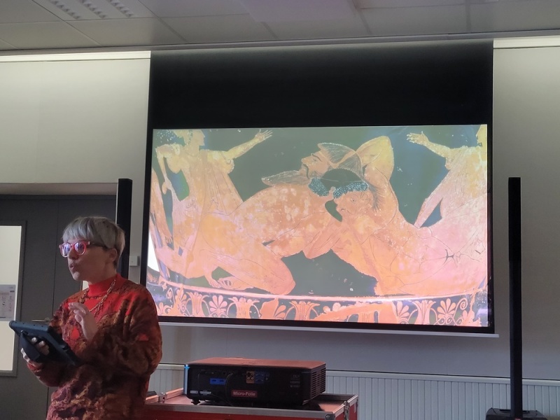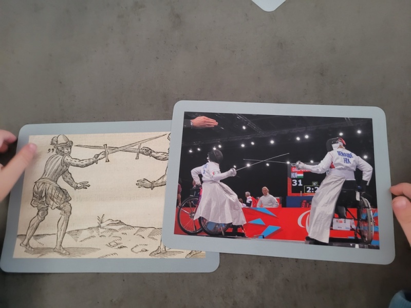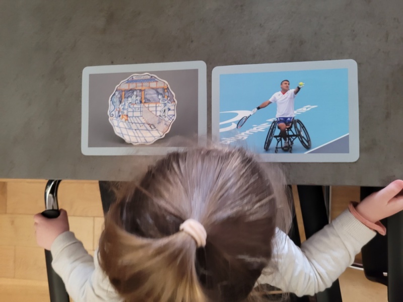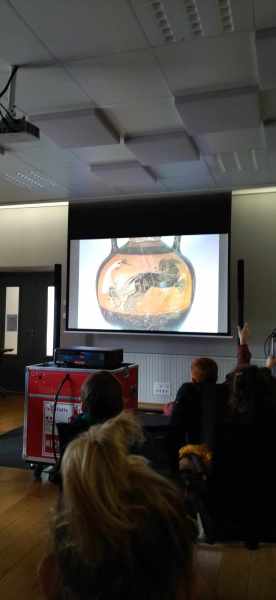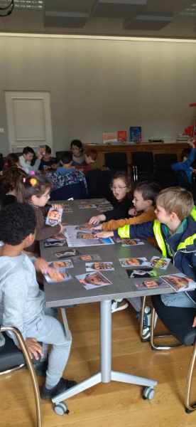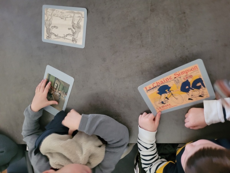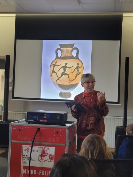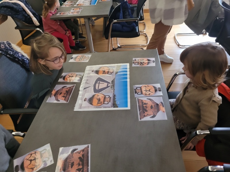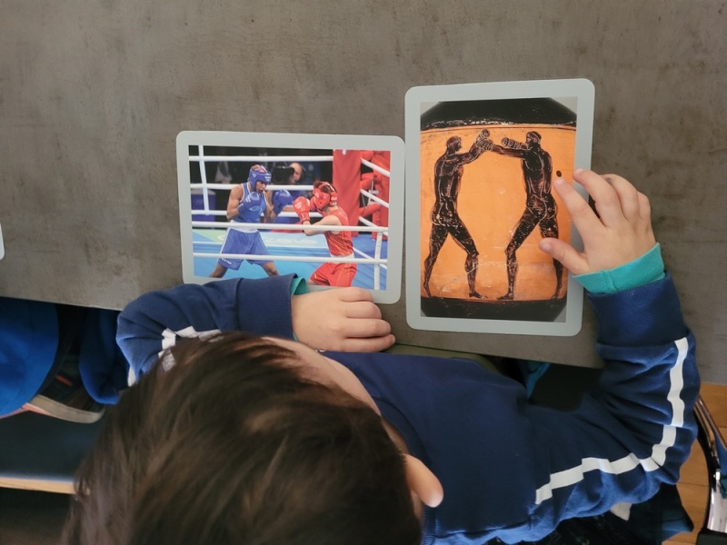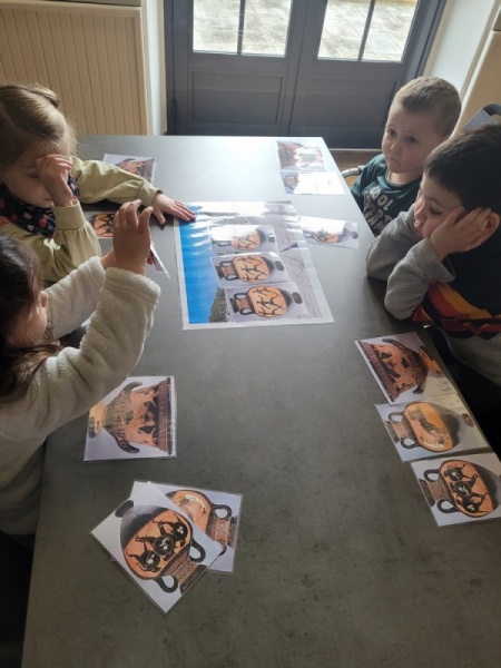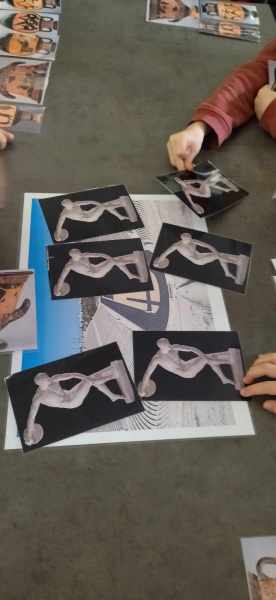 Pour nos classes, nous avions choisi le thème du sport. Claire nous a présenté et décrit 4 objets très anciens (plus de 2400 ans) qui prouvent que le sport existe depuis très longtemps : 3 amphores et 1 cratère. Ensuite, nous avons fait un petit jeu dans lequel il fallait trouver l’œuvre qui correspondait au sport annoncé par Claire (course, course de chars, course avec bouclier, lutte) et placer la photo sur l’affiche du stade. Puis elle nous a distribué à chacun la photo d’une œuvre et nous devions trouver la photo du sport qui correspondait. Pour terminer, nous avons choisi et collé la photo d’une des œuvres, sur le dessin d’une amphore que nous avons fini de décorer à l’école.