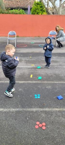 Atelier « relais » avec Tiphaine où il fallait aller vite pour passer la balle à son coéquipier afin que chacun puisse réaliser le tour complet du circuit (slalom, course de haies, cerceaux…).