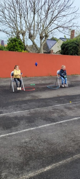 Atelier « relais » avec Tiphaine où il fallait aller vite pour passer la balle à son coéquipier afin que chacun puisse réaliser le tour complet du circuit (slalom, course de haies, cerceaux…).