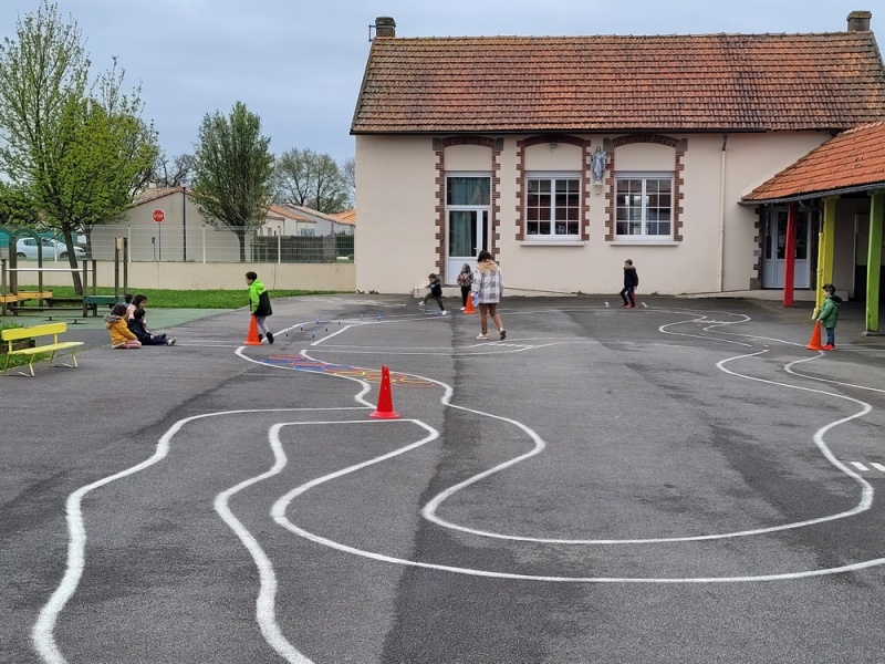 Atelier « relais » avec Tiphaine où il fallait aller vite pour passer la balle à son coéquipier afin que chacun puisse réaliser le tour complet du circuit (slalom, course de haies, cerceaux…).