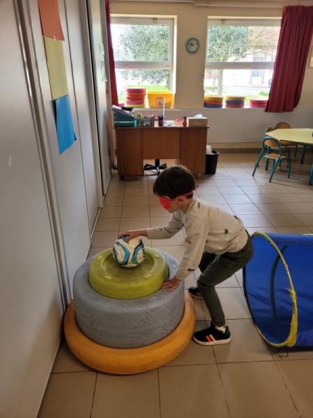 Atelier « parcours » où nous avons suivi un petit parcours les yeux bandés (après un passage les yeux ouverts). Florence nous parlait (et parfois nous tenait pour les plus craintifs) pour nous guider jusqu’au ballon à grelots.