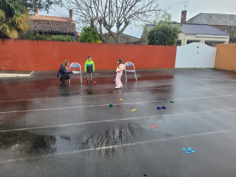 Atelier « relais » avec Tiphaine où il fallait aller vite pour passer la balle à son coéquipier afin que chacun puisse réaliser le tour complet du circuit (slalom, course de haies, cerceaux…).