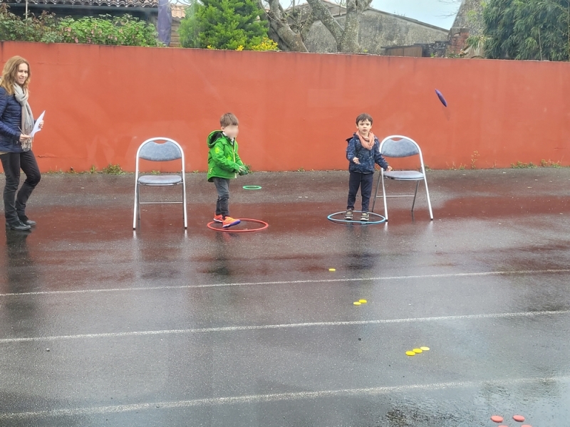 Atelier « relais » avec Tiphaine où il fallait aller vite pour passer la balle à son coéquipier afin que chacun puisse réaliser le tour complet du circuit (slalom, course de haies, cerceaux…).