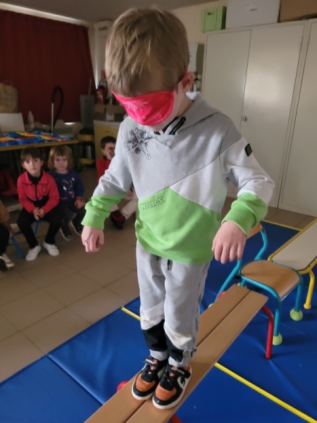 Atelier « parcours » où nous avons suivi un petit parcours les yeux bandés (après un passage les yeux ouverts). Florence nous parlait (et parfois nous tenait pour les plus craintifs) pour nous guider jusqu’au ballon à grelots.