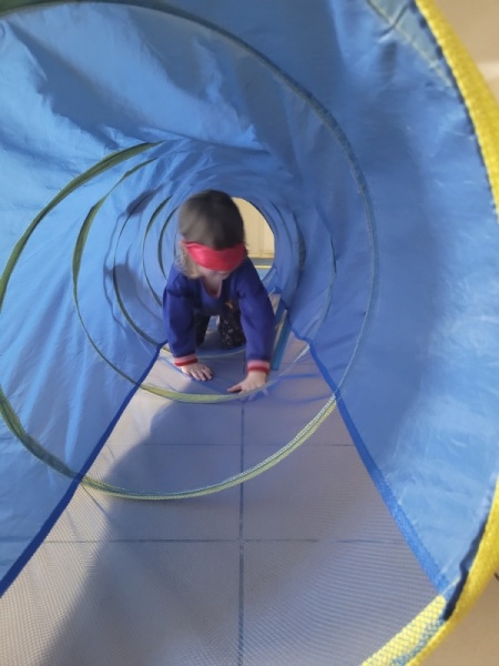 Atelier « parcours » où nous avons suivi un petit parcours les yeux bandés (après un passage les yeux ouverts). Florence nous parlait (et parfois nous tenait pour les plus craintifs) pour nous guider jusqu’au ballon à grelots.