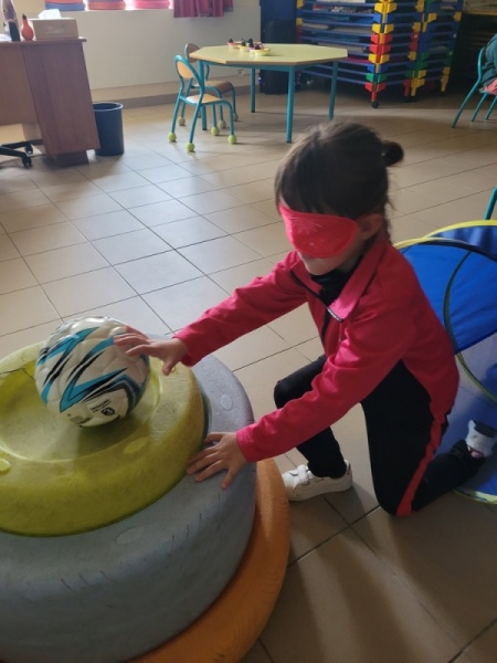 Atelier « parcours » où nous avons suivi un petit parcours les yeux bandés (après un passage les yeux ouverts). Florence nous parlait (et parfois nous tenait pour les plus craintifs) pour nous guider jusqu’au ballon à grelots.
