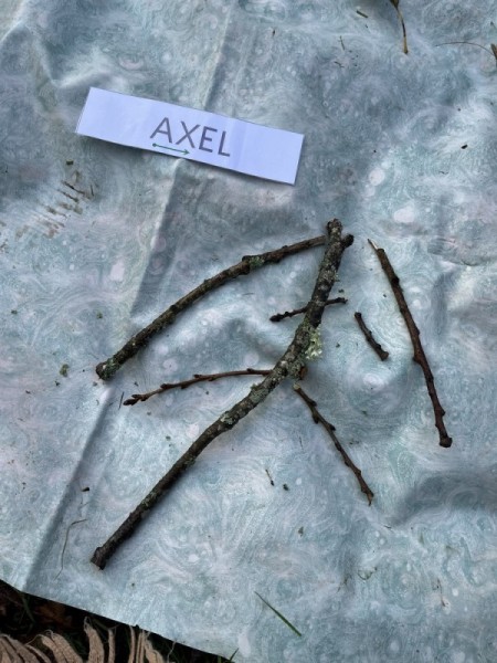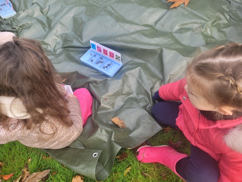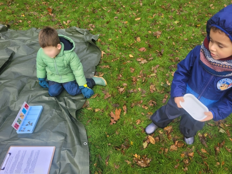 Les PS ont travaillé les notions sur/sous (une branche), devant/derrière (un arbre), à côté de…Puis dans un atelier sur la quantité 2, ils sont allés chercher 2 cailloux puis il fallait trouver les cartes du chiffre 2, de la main qui fait 2 etc.