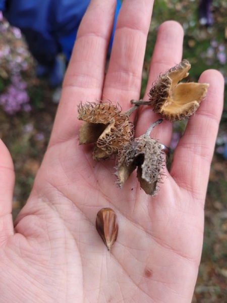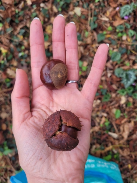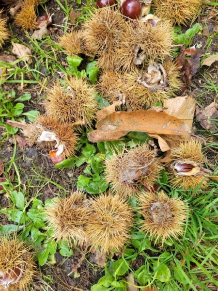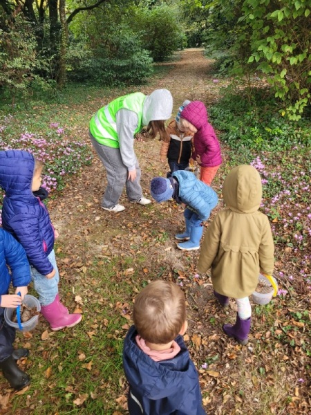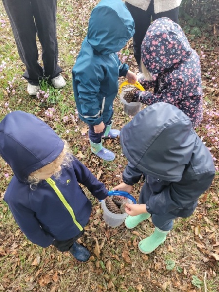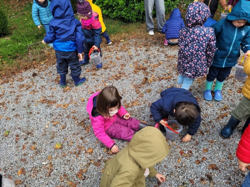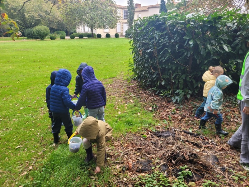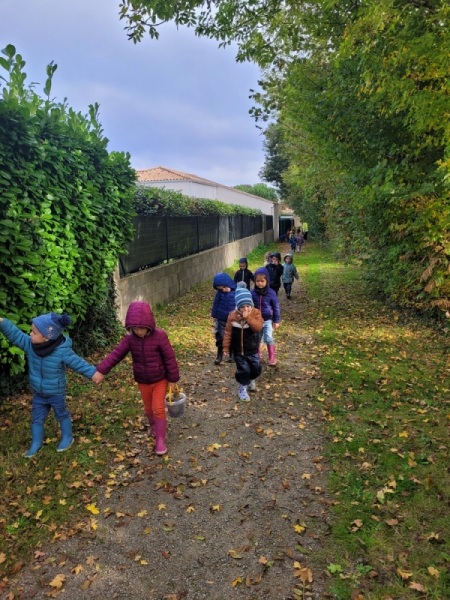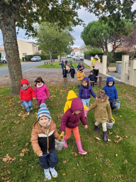 Mardi 14 octobre, nous sommes allés dans le parc de Mr et Mme de Guerry puis nous avons fait un détour par les lotissements avant de rentrer. Nous avons observé les signes de l’automne : les feuilles mortes par terre, les couleurs des feuilles dans les arbres, les champignons. Nous avons ramassés dans nos seaux des marrons, les glands, des faînes, des pommes de pin, des pommes et des châtaignes que nous avons ensuite trié en classe.
