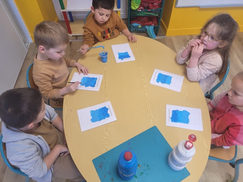 Pour continuer le travail autour des couleurs, nous avons fait le mélange d’une couleur avec du blanc. Nous avons observé que la couleur devenait plus claire. Les MS ont testé en ajoutant du noir pour voir apparaître des couleurs plus foncées.