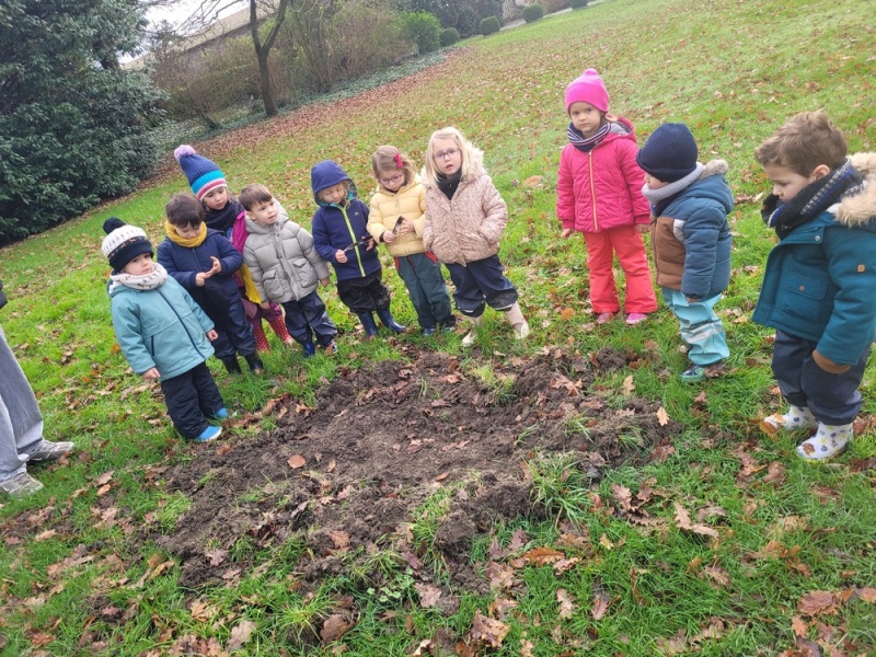 Nous avons d’abord fait un petit tour du parc pour observer les changements: il n’y avait plus de pommes dans les arbres, pratiquement plus de fleurs, beaucoup de terre à cause du passage des sangliers…
