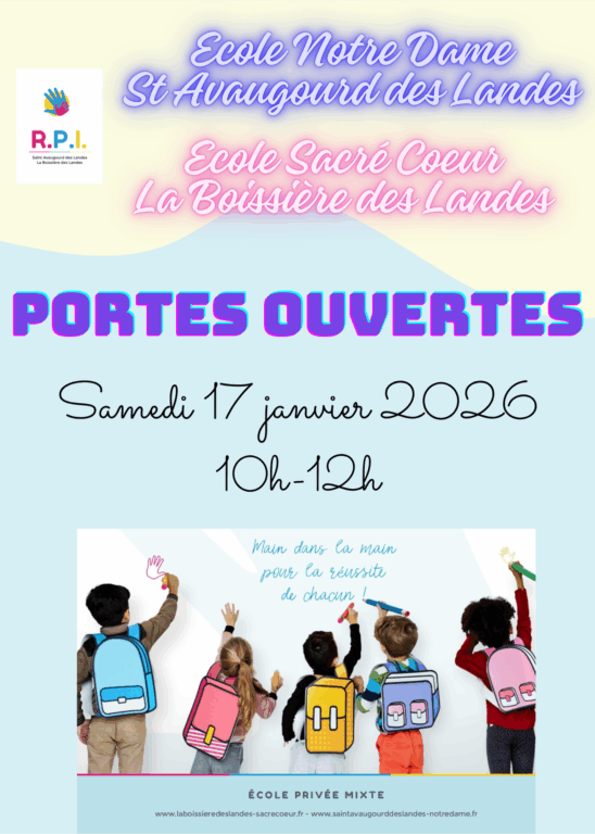A Noter : PORTES OUVERTES le samedi 17 janvier 2026 de 10h à 12h sur les deux sites (Ecole Sacré Coeur à la Boissière des Landes et Ecole Notre Dame à St Avaugourd des Landes)